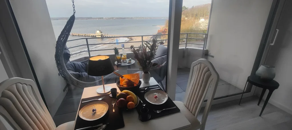 Genießen Sie den Sonnenuntergang auf unserem nordwestlich ausgerichteten Balkon – gemütlich im Hängesessel mit einer frischen Brise Meeresluft. Nur wenige Schritte trennen Sie vom feinen Sandstrand und der Promenade, während der autofreie Bereich vor dem Haus für absolute Entspannung sorgt.